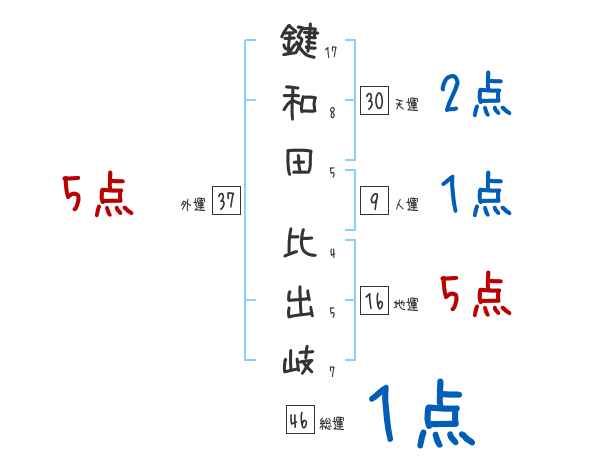 外運![]() | 鍵和田比出岐さんの外運は37画の5つ星!努力家で順応性に優れる。現実的な考え方ができ忠実に物事をこなす。 生活面を象徴する運勢です。外部から受ける影響力を表し、結婚運、家庭運や職場、環境への順応性を表します。 |