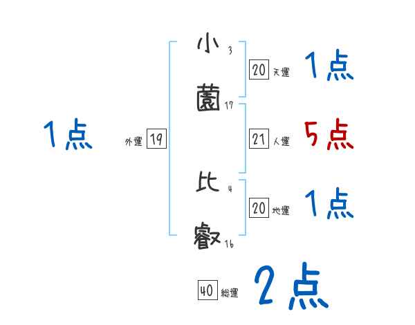 外運![]() | 小薗比叡さんの外運は19画の1つ星!優れた才能を持ちますが、協調性が足りないことも。周りの人と協力する事を意識しましょう。 生活面を象徴する運勢です。外部から受ける影響力を表し、結婚運、家庭運や職場、環境への順応性を表します。 |