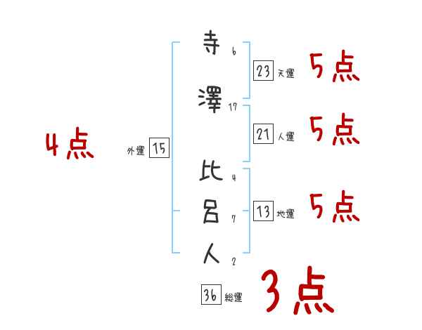 総運![]() | 寺澤比呂人さんの総運は36画の3つ星!先見性が豊かです。多少神経質で苦労することも。 あなたの人生を表す1番重要な運勢です。生涯を通じて影響する総合運となり、主に50歳以降の晩年期に影響を及ぼします。 |