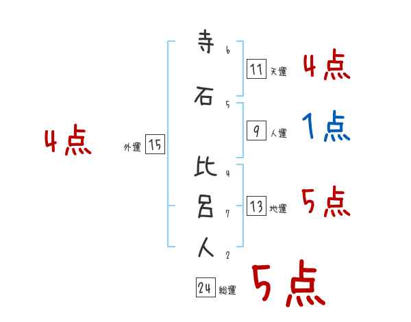 天運![]() | 寺石比呂人さんの天運は11画の4つ星!着実に富や地位を得る幸運な人生。 家系が持つ宿命的な運勢を表します。祖先から受け継いだ苗字ですので自分の力が及びません。家柄を象徴します。 |