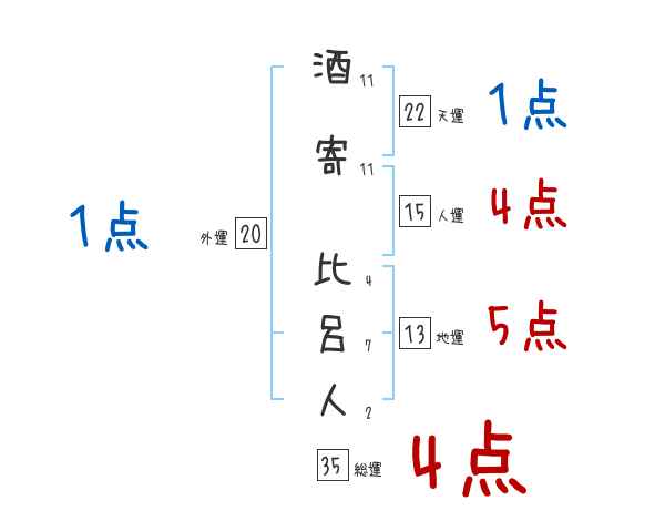 天運![]() | 酒寄比呂人さんの天運は22画の1つ星!努力することが苦手ないっぽう手先が器用。芸術性にも優れる。 家系が持つ宿命的な運勢を表します。祖先から受け継いだ苗字ですので自分の力が及びません。家柄を象徴します。 |