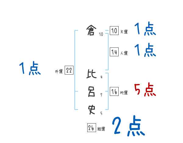地運![]() | 倉比呂史さんの地運は16画の5つ星!人望が厚く大きく発展する。逆転成功が見える。 個性を表す基礎的な運勢です。性格形成や対人関係、行動力など家庭環境に影響されます。主に誕生してから20歳くらいまでの若年期の運勢を表します。 |