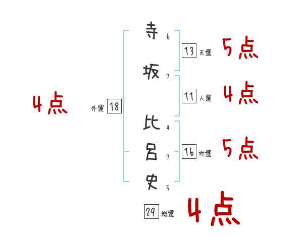 総運![]() | 寺坂比呂史さんの総運は29画の4つ星!完全主義で才能がある。厳格な心の持ち主。 あなたの人生を表す1番重要な運勢です。生涯を通じて影響する総合運となり、主に50歳以降の晩年期に影響を及ぼします。 |