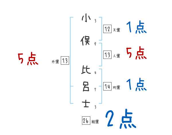 人運![]() | 小俣比呂士さんの人運は13画の5つ星!才能に恵まれ人気がある。名声を手に入れる。円満な人生。 性格や才能などを表す2番目に重要な運勢です。人間関係や協調性、社会的な成功に影響します。主に20歳から50歳ぐらいまでの中年期の運勢を表します。 |