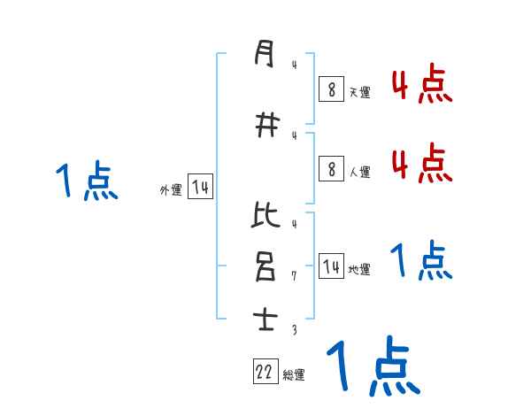 外運![]() | 月井比呂士さんの外運は14画の1つ星!人に対して優しいがストレスを溜め込みがち。人間関係のトラブルを避けるよう気をつけましょう。 生活面を象徴する運勢です。外部から受ける影響力を表し、結婚運、家庭運や職場、環境への順応性を表します。 |