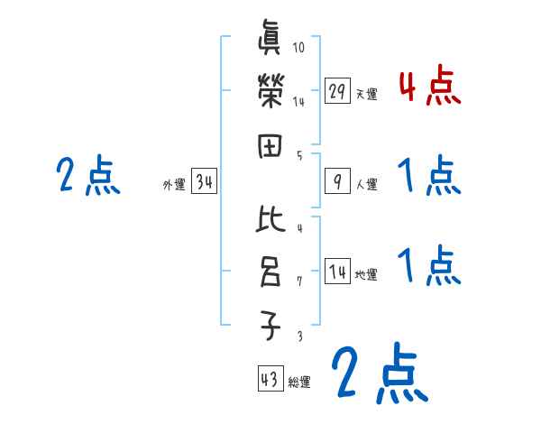 天運![]() | 眞榮田比呂子さんの天運は29画の4つ星!完全主義で才能がある。厳格な心の持ち主。 家系が持つ宿命的な運勢を表します。祖先から受け継いだ苗字ですので自分の力が及びません。家柄を象徴します。 |