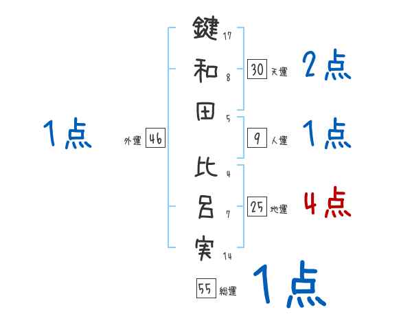 天運![]() | 鍵和田比呂実さんの天運は30画の2つ星!浮き沈みの激しさに注意しましょう。 家系が持つ宿命的な運勢を表します。祖先から受け継いだ苗字ですので自分の力が及びません。家柄を象徴します。 |