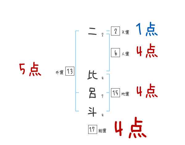 天運![]() | 二比呂斗さんの天運は2画の1つ星!優しいですが積極性や意思の強さに欠ける傾向があります。家庭環境の乱れに注意しましょう。 家系が持つ宿命的な運勢を表します。祖先から受け継いだ苗字ですので自分の力が及びません。家柄を象徴します。 |