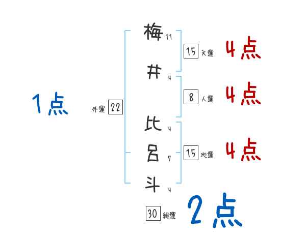 地運![]() | 梅井比呂斗さんの地運は15画の4つ星!人徳があり出世する。順調に物事を進め円満な人生。 個性を表す基礎的な運勢です。性格形成や対人関係、行動力など家庭環境に影響されます。主に誕生してから20歳くらいまでの若年期の運勢を表します。 |