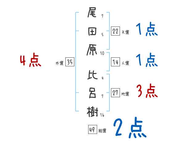 外運![]() | 尾田原比呂樹さんの外運は35画の4つ星!温厚な性格で感受性が高い。穏和な性格で人望が厚い。 生活面を象徴する運勢です。外部から受ける影響力を表し、結婚運、家庭運や職場、環境への順応性を表します。 |
