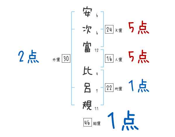 人運![]() | 安次富比呂規さんの人運は16画の5つ星!人望が厚く大きく発展する。逆転成功が見える。 性格や才能などを表す2番目に重要な運勢です。人間関係や協調性、社会的な成功に影響します。主に20歳から50歳ぐらいまでの中年期の運勢を表します。 |