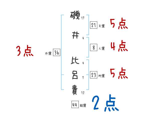 外運![]() | 磯井比呂貴さんの外運は36画の3つ星!先見性が豊かです。多少神経質で苦労することも。 生活面を象徴する運勢です。外部から受ける影響力を表し、結婚運、家庭運や職場、環境への順応性を表します。 |