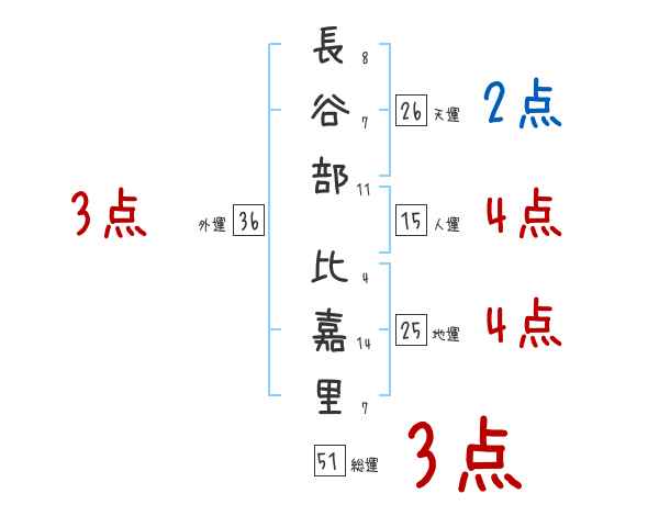 天運![]() | 長谷部比嘉里さんの天運は26画の2つ星!波瀾万丈かも。信頼できる人を大事にしましょう。 家系が持つ宿命的な運勢を表します。祖先から受け継いだ苗字ですので自分の力が及びません。家柄を象徴します。 |