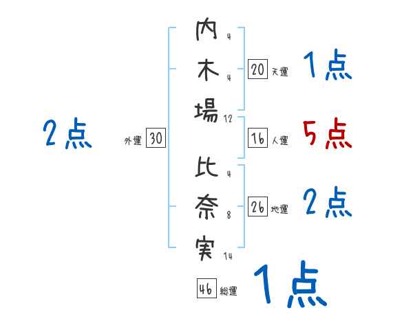 人運![]() | 内木場比奈実さんの人運は16画の5つ星!人望が厚く大きく発展する。逆転成功が見える。 性格や才能などを表す2番目に重要な運勢です。人間関係や協調性、社会的な成功に影響します。主に20歳から50歳ぐらいまでの中年期の運勢を表します。 |