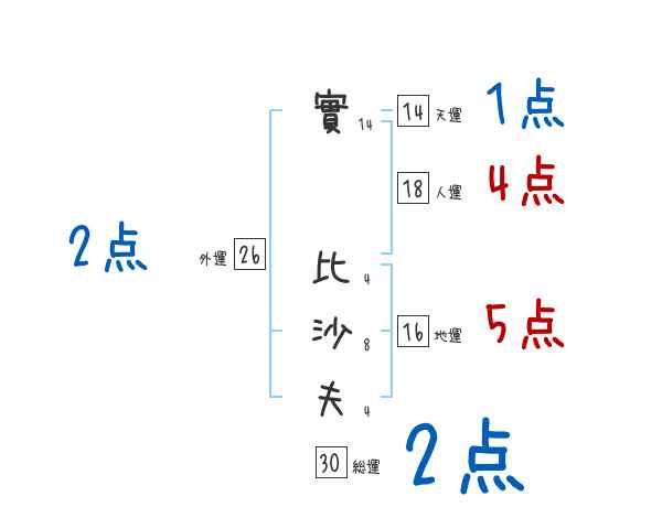 外運![]() | 實比沙夫さんの外運は26画の2つ星!波瀾万丈かも。信頼できる人を大事にしましょう。 生活面を象徴する運勢です。外部から受ける影響力を表し、結婚運、家庭運や職場、環境への順応性を表します。 |