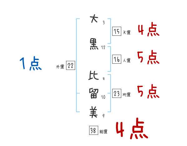 | 外運  | 大黒比留美さんの外運は22画の1つ星!努力することが苦手ないっぽう手先が器用。芸術性にも優れる。生活面を象徴する運勢です。外部から受ける影響力を表し、結婚運、家庭運や職場、環境への順応性を表します。 |