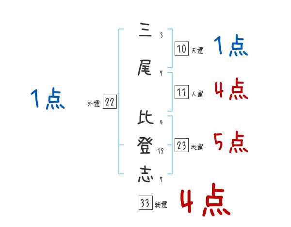 天運![]() | 三尾比登志さんの天運は10画の1つ星!不安を感じやすい傾向。ストレスを抱えないように注意しましょう。 家系が持つ宿命的な運勢を表します。祖先から受け継いだ苗字ですので自分の力が及びません。家柄を象徴します。 |