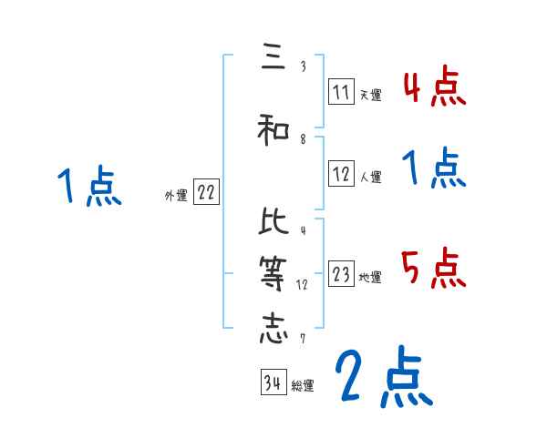 | 外運  | 三和比等志さんの外運は22画の1つ星!努力することが苦手ないっぽう手先が器用。芸術性にも優れる。生活面を象徴する運勢です。外部から受ける影響力を表し、結婚運、家庭運や職場、環境への順応性を表します。 |