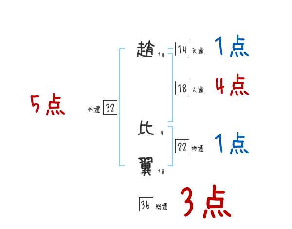 外運![]() | 趙比翼さんの外運は32画の5つ星!柔軟性があり成功する。チャンスが多く金運が良い。 生活面を象徴する運勢です。外部から受ける影響力を表し、結婚運、家庭運や職場、環境への順応性を表します。 |