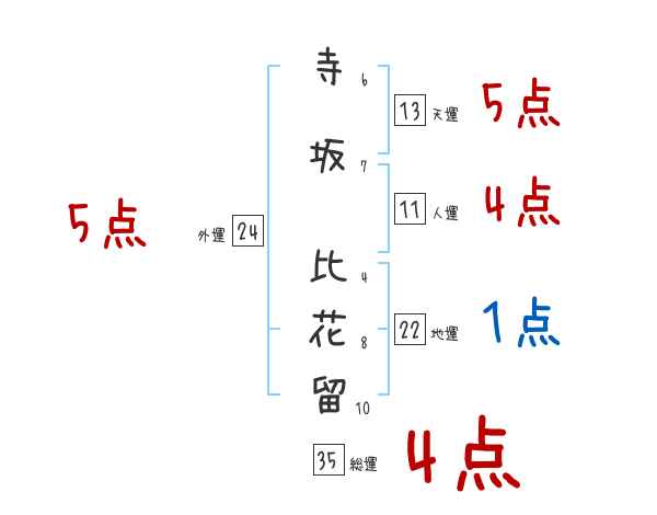 外運![]() | 寺坂比花留さんの外運は24画の5つ星!家庭運が良く順調な人生。金運にも恵まれる。 生活面を象徴する運勢です。外部から受ける影響力を表し、結婚運、家庭運や職場、環境への順応性を表します。 |