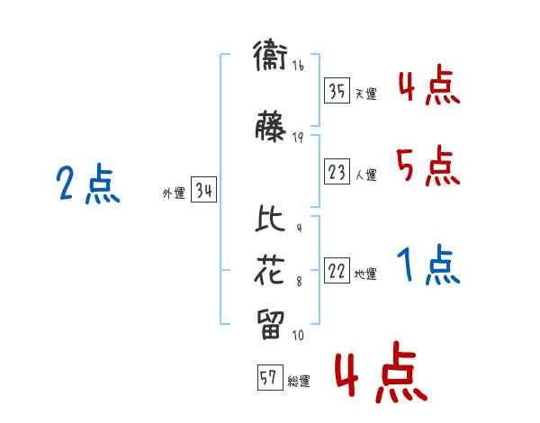 総運![]() | 衞藤比花留さんの総運は57画の4つ星!向上心があり人望がある。地位を得る。 あなたの人生を表す1番重要な運勢です。生涯を通じて影響する総合運となり、主に50歳以降の晩年期に影響を及ぼします。 |