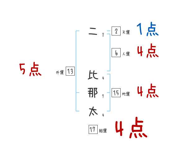 天運![]() | 二比那太さんの天運は2画の1つ星!優しいですが積極性や意思の強さに欠ける傾向があります。家庭環境の乱れに注意しましょう。 家系が持つ宿命的な運勢を表します。祖先から受け継いだ苗字ですので自分の力が及びません。家柄を象徴します。 |