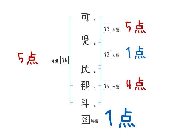 外運![]() | 可児比那斗さんの外運は16画の5つ星!人望が厚く大きく発展する。逆転成功が見える。 生活面を象徴する運勢です。外部から受ける影響力を表し、結婚運、家庭運や職場、環境への順応性を表します。 |