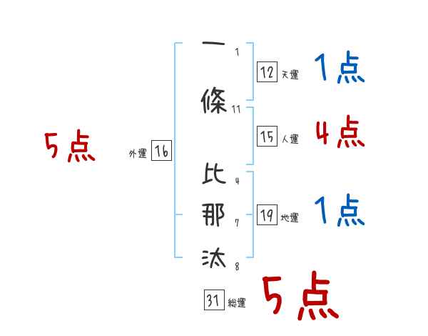 外運![]() | 一條比那汰さんの外運は16画の5つ星!人望が厚く大きく発展する。逆転成功が見える。 生活面を象徴する運勢です。外部から受ける影響力を表し、結婚運、家庭運や職場、環境への順応性を表します。 |