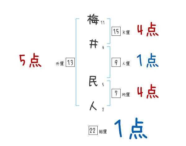 地運![]() | 梅井民人さんの地運は7画の4つ星!強い意志や信念を持ち独立心が強い。自立する。 個性を表す基礎的な運勢です。性格形成や対人関係、行動力など家庭環境に影響されます。主に誕生してから20歳くらいまでの若年期の運勢を表します。 |