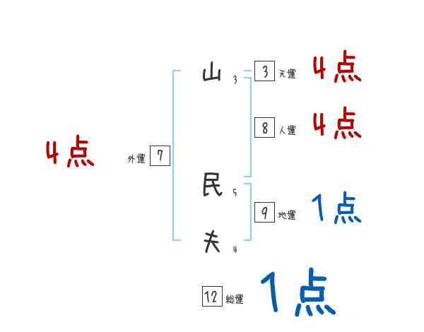 天運![]() | 山民夫さんの天運は3画の4つ星!活動的で才能に恵まれ、多くの信頼を得る。希望に満ち成長する。 家系が持つ宿命的な運勢を表します。祖先から受け継いだ苗字ですので自分の力が及びません。家柄を象徴します。 |