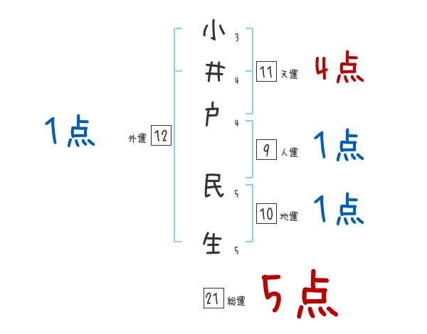 天運![]() | 小井戸民生さんの天運は11画の4つ星!着実に富や地位を得る幸運な人生。 家系が持つ宿命的な運勢を表します。祖先から受け継いだ苗字ですので自分の力が及びません。家柄を象徴します。 |