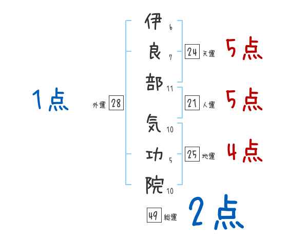 天運![]() | 伊良部気功院さんの天運は24画の5つ星!家庭運が良く順調な人生。金運にも恵まれる。 家系が持つ宿命的な運勢を表します。祖先から受け継いだ苗字ですので自分の力が及びません。家柄を象徴します。 |