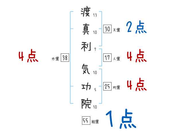 天運![]() | 渡真利気功院さんの天運は30画の2つ星!浮き沈みの激しさに注意しましょう。 家系が持つ宿命的な運勢を表します。祖先から受け継いだ苗字ですので自分の力が及びません。家柄を象徴します。 |