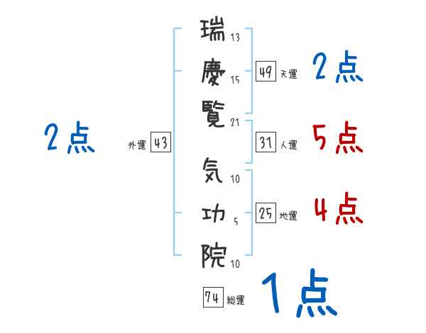 天運![]() | 瑞慶覧気功院さんの天運は49画の2つ星!不安定な性格で明暗がある人生。周りの人には支援されやすい。 家系が持つ宿命的な運勢を表します。祖先から受け継いだ苗字ですので自分の力が及びません。家柄を象徴します。 |
