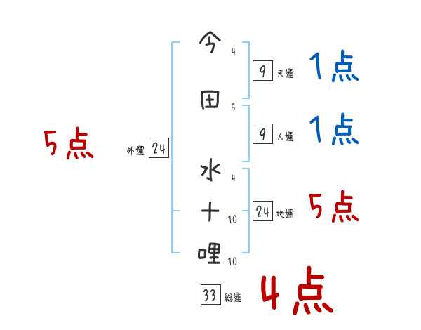 外運![]() | 今田水十哩さんの外運は24画の5つ星!家庭運が良く順調な人生。金運にも恵まれる。 生活面を象徴する運勢です。外部から受ける影響力を表し、結婚運、家庭運や職場、環境への順応性を表します。 |