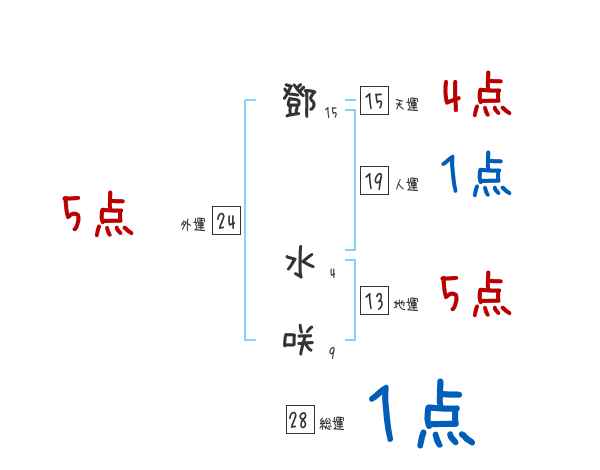外運![]() | 鄧水咲さんの外運は24画の5つ星!家庭運が良く順調な人生。金運にも恵まれる。 生活面を象徴する運勢です。外部から受ける影響力を表し、結婚運、家庭運や職場、環境への順応性を表します。 |