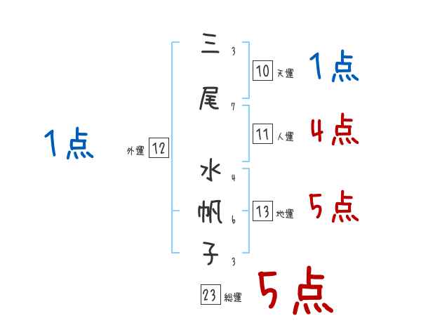 天運![]() | 三尾水帆子さんの天運は10画の1つ星!不安を感じやすい傾向。ストレスを抱えないように注意しましょう。 家系が持つ宿命的な運勢を表します。祖先から受け継いだ苗字ですので自分の力が及びません。家柄を象徴します。 |