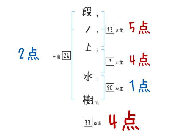 外運![]() | 段ノ上水樹さんの外運は26画の2つ星!波瀾万丈かも。信頼できる人を大事にしましょう。 生活面を象徴する運勢です。外部から受ける影響力を表し、結婚運、家庭運や職場、環境への順応性を表します。 |