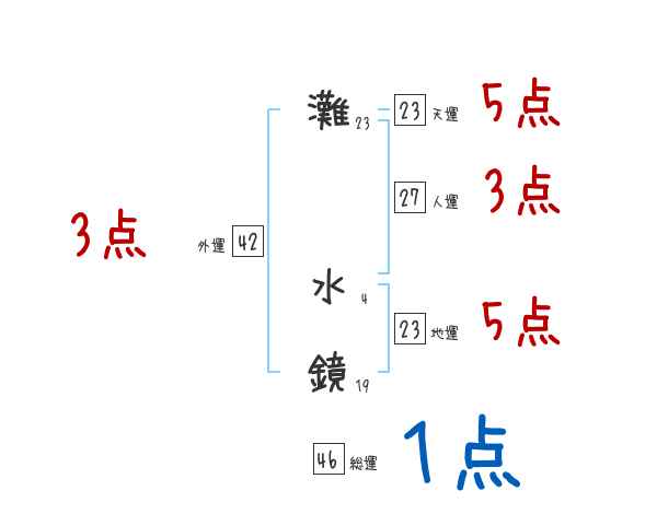 天運![]() | 灘水鏡さんの天運は23画の5つ星!想像力に優れ活力がある。一代で成功し名誉を手に入れる。 家系が持つ宿命的な運勢を表します。祖先から受け継いだ苗字ですので自分の力が及びません。家柄を象徴します。 |
