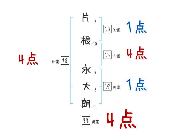 天運![]() | 片根永大朗さんの天運は14画の1つ星!人に対して優しいがストレスを溜め込みがち。人間関係のトラブルを避けるよう気をつけましょう。 家系が持つ宿命的な運勢を表します。祖先から受け継いだ苗字ですので自分の力が及びません。家柄を象徴します。 |