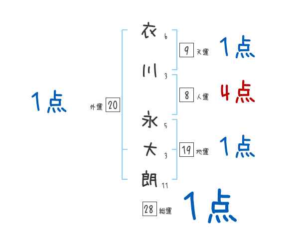 総運![]() | 衣川永大朗さんの総運は28画の1つ星!家庭環境に注意。スポーツで活躍できる能力があるかも。 あなたの人生を表す1番重要な運勢です。生涯を通じて影響する総合運となり、主に50歳以降の晩年期に影響を及ぼします。 |