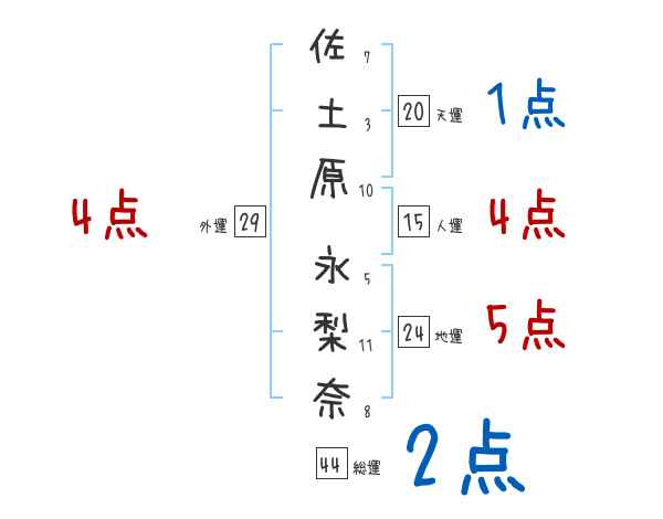 総運![]() | 佐土原永梨奈さんの総運は44画の2つ星!誠実で慎重な性格。物事を考えすぎないように注意しましょう。 あなたの人生を表す1番重要な運勢です。生涯を通じて影響する総合運となり、主に50歳以降の晩年期に影響を及ぼします。 |