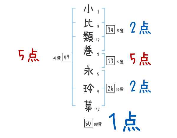 外運![]() | 小比類巻永玲菜さんの外運は47画の5つ星!実力が開花し発展する円満な人生。財に恵まれる。 生活面を象徴する運勢です。外部から受ける影響力を表し、結婚運、家庭運や職場、環境への順応性を表します。 |