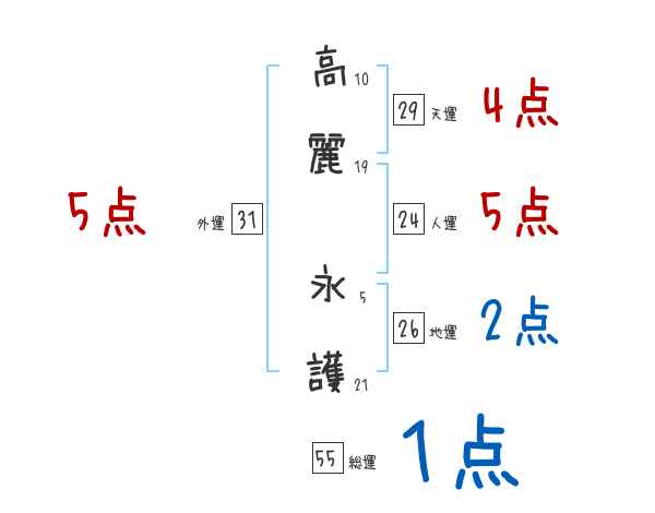 天運![]() | 高麗永護さんの天運は29画の4つ星!完全主義で才能がある。厳格な心の持ち主。 家系が持つ宿命的な運勢を表します。祖先から受け継いだ苗字ですので自分の力が及びません。家柄を象徴します。 |