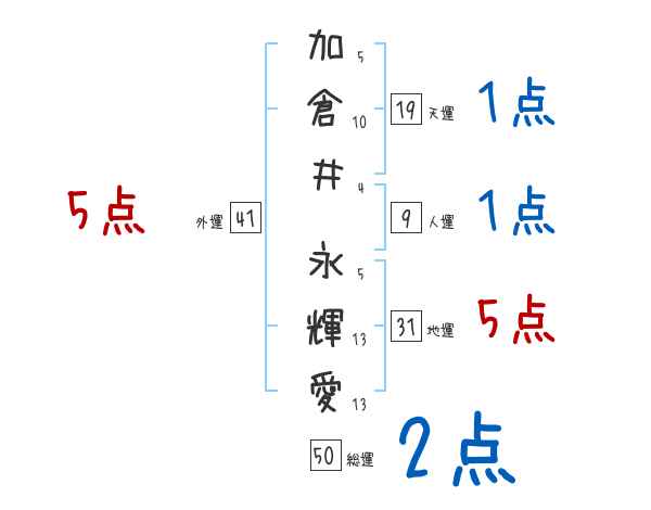 天運![]() | 加倉井永輝愛さんの天運は19画の1つ星!優れた才能を持ちますが、協調性が足りないことも。周りの人と協力する事を意識しましょう。 家系が持つ宿命的な運勢を表します。祖先から受け継いだ苗字ですので自分の力が及びません。家柄を象徴します。 |
