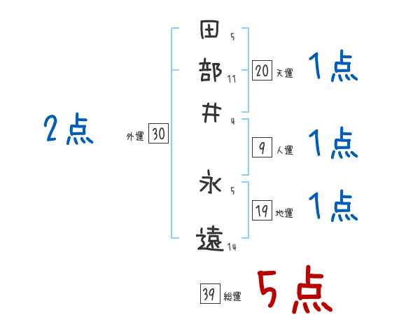総運![]() | 田部井永遠さんの総運は39画の5つ星!社交性に優れ人望が厚い。人の上に立ち成功する。 あなたの人生を表す1番重要な運勢です。生涯を通じて影響する総合運となり、主に50歳以降の晩年期に影響を及ぼします。 |