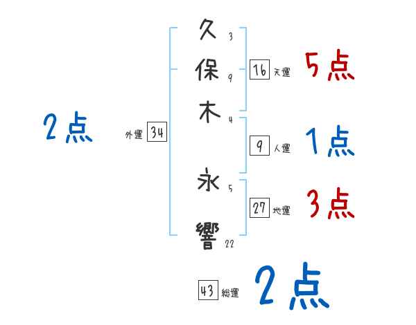 総運![]() | 久保木永響さんの総運は43画の2つ星!頑固な性格で独立心が強いかも。やや非現実的で浪費に注意しましょう。 あなたの人生を表す1番重要な運勢です。生涯を通じて影響する総合運となり、主に50歳以降の晩年期に影響を及ぼします。 |