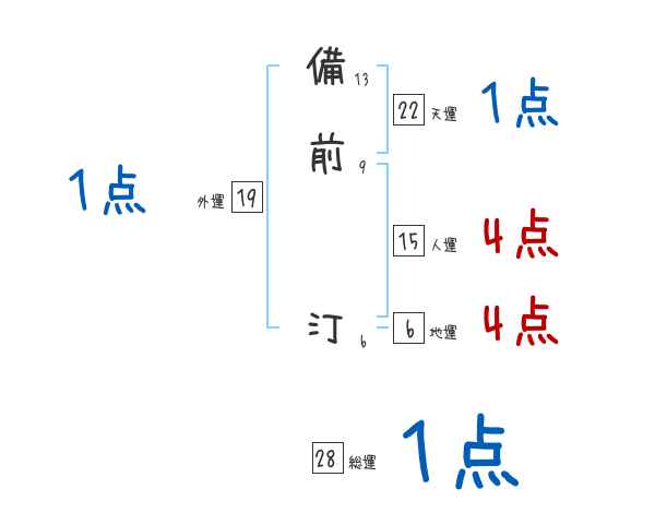 天運![]() | 備前汀さんの天運は22画の1つ星!努力することが苦手ないっぽう手先が器用。芸術性にも優れる。 家系が持つ宿命的な運勢を表します。祖先から受け継いだ苗字ですので自分の力が及びません。家柄を象徴します。 |