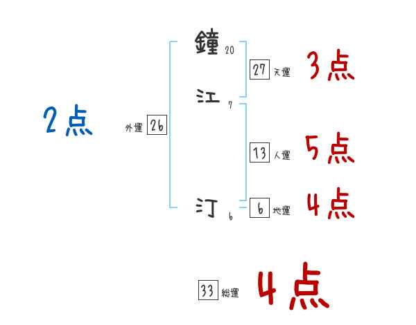 外運![]() | 鐘江汀さんの外運は26画の2つ星!波瀾万丈かも。信頼できる人を大事にしましょう。 生活面を象徴する運勢です。外部から受ける影響力を表し、結婚運、家庭運や職場、環境への順応性を表します。 |