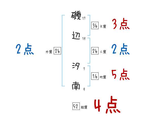 外運![]() | 磯辺汐南さんの外運は26画の2つ星!波瀾万丈かも。信頼できる人を大事にしましょう。 生活面を象徴する運勢です。外部から受ける影響力を表し、結婚運、家庭運や職場、環境への順応性を表します。 |